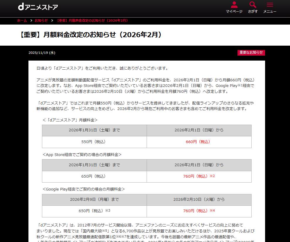 今更ですが、私の使っているサービスであるdアニメストア、彼の値上げが2月からはじまりました。